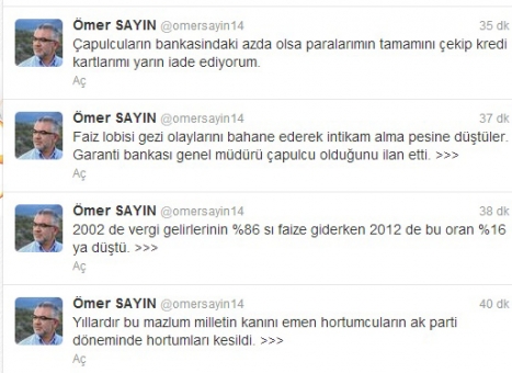 Gezi Parkı’na Garanti Bankası’ndan verilen destek nedeniyle bu banka ile çalışmak istemediğin ve tepki olarak da Garanti Bankası’ndaki tüm hesabını kapatacağını dile getiren Ak Parti İl Başkanı Ömer Sayın, sosyal paylaşım sitesi Twitter’dan da duyuruda bulundu. Ömer Sayın Twitter üzerinden yaptığı duyuruda “Yıllardır bu mazlum milletin kanını emen hortumcuların Ak Parti döneminde hortumları kesildi. 2002’de vergi gelirlerinin % 86’sı faize giderken 2012’de bu oran % 16’ya düştü. Faiz lobisi gezi olaylarını bahane ederek intikam alma peşine düştüler. Garanti Bankası Genel Müdürü çapulcu olduğunu ilan etti. Çapulcuların bankasındaki az da olsa paralarımın tamamını çekip kredi kartlarımı yarın iade ediyorum” dedi.