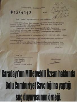Karadayı, ayrıca Özcan hakkındaki Bolu Cumhuriyet Savcılığı’na yaptığı suç duyurusunun örneklerini haber merkezimizle paylaştı. Karadayı’nın savcılığa yaptığı suç duyurusunda yer verdiği ifadeler şöyle: “1 Haziran 2013 tarihinde CHP Bolu Milletvekili Tanju Özcan ve CHP Bolu İl Başkanlığı tarafından cep telefonuma 7 defa mesaj çekilerek, saat 17.30’da Bolu Valiliği önünde Taksim’e destekte buluşalım, denilmektedir. Bilindiği gibi Taksim’e destek mitingi adı altında yapılan hareketlerle memleketimize milyarlarca lira zarar vermişlerdir. Eylemcilerin yaktıkları araçlar ve verdikleri zararlar benim vergilerimle yapılan ve alınan kamu mallarıdır. Özellikle hiç alakası olmadığı halde Bolu’nun böyle bir eyleme dahiledilmesi tamamen provokedir. Tanju Özcan’dan şikayetçiyim. Devlete ait malların zarara uğraması karşısında zararın zarara sebep olanlardan karşılanmasını arz ederim.”