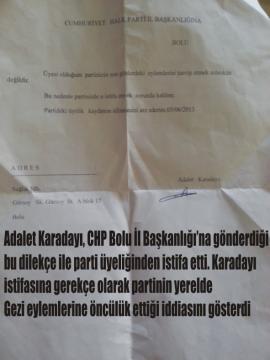 Karadayı, parti üyeliğinin iptali istemiyle CHP Bolu İl Başkanlığı’na gönderdiği yazılı dilekçesinde ise şu ifadelere yer verdi: “Üyesi bulunduğum partinizdeki son günlerdeki eylemlerini tasvip etmek mümkün değildir. Bu nedenle partinizden istifa etmek zorunda kaldım. Partideki üyelik kaydımın silinmesini arz ederim.”