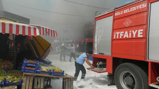 Edinilen bilgiye göre, Karamanlı Mahallesi’nde bulunan hal pazarındaki bir manav dükkanının çatısında elektrik kontağından yangın çıktı. Alevler kısa sürede çatı katını sarınca itfaiye ekiplerine haber verildi. Pazartesi günleri kurulan pazaryerinin yoğun olması nedeniyle vatandaşlar büyük korku yaşarken, kısa sürede olay yerine gelen Bolu Belediyesi İtfaiye Müdürlüğü’ne bağlı ekipler alevlere müdahale etti. Çatıya çıkan itfaiyeciler köpüklü ve tazyikli suyla alevleri kontrol etmeye çalıştı. Polisin geniş güvenlik önlemi aldığı yangını vatandaşlar da meraklı gözlerle izledi.