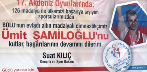17. Akdeniz Oyunları’nda barfikste şampiyon olan Bolu’nun gurur kaynağı olan milli sporcumuz Ümit Şamiloğlu için Gençlik ve Spor Bakanı Suat Kılıç tarafından yaptırılan pankart Olimpiyat Gençlik Evi’nin duvarlarına asıldı. Kılıç’ın yaptırdığı pankartta, “17. Akdeniz Oyunları’nda 126 madalya ile ülkemizi başarıya taşıyan sporcularımızdan Bolu’nun evladı altın madalyalı cimnastikçimiz Ümit Şamiloğlu’nu kutlar, başarılarının devamını dilerim.”