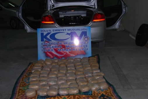 Bolu Emniyet Müdürlüğü Kaçakçılık ve Organize Suçlarla Mücadele Şubesi ekipleri, İstanbul'a gitmekte olan otomobili takibe aldı. Tem Otoyolu'nda bulunan bir dinlenme tesisinin önünde araç durdurulurken, narkotik köpeği "Zeus" ile arama yapıldı. Aracın gizli bölmelerine zulalanmış esrarlar bulundu. Bir aylık bebekleri ve eşiyle birlikte İstanbul'a giden Van İl Jandarma Komutanlığı'nda görevli uzman çavuş H.G. gözaltına alındı.