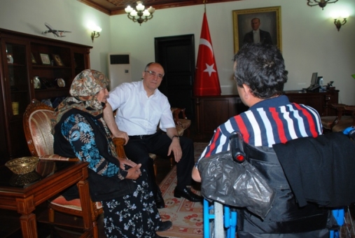 Vali İbrahim Özçimen, tekerlekli sandalye ile ziyaretine gelen engelli Ekrem Mutlu'nun tekerlekli sandalyesini sürerek makamından çıkmasına yardımcı oldu.