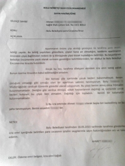 “Apartmanın önüne çöp atıldığı gerekçesi ile tarafıma para cezası tebliği yapıldı. Bu tebliğ yapılırken görevlilere çöpün bana ait olmadığını, kedilerin apartmanın önündeki çöpü dağıtmaları nedeni ile iş dönüşümde çöpü bizzat topladığımı belirttim. Bu beyanlarımı Belediye Encümenine yazılı olarak vermem gerektiğini belirttiklerinden, bir dilekçe ile Belediye Encümenine itirazda bulundum.