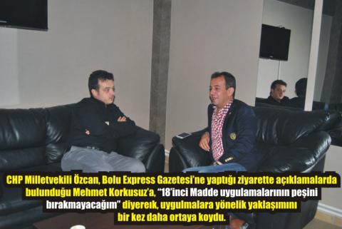 Açıklamalarının devamında, geçtiğimiz günlerde Başbakan Erdoğan tarafından yanıtlandırılması istemiyle TBMM’ye ilettiği soru önergesini aktaran Özcan, ayrıca Menderes Türel’le de konu hakkında bir görüşme yaptığını ilk kez açıkladı. Özcan, “Başbakan’a Bolu’daki 18’inci Madde uygulamalarını sordum. Bu iddia doğruysa, ilgili milletvekili için ne yaptırım uygulanacağını da sordum. Öte yandan bu iddianın doğru olmadığı takdirde iddiayı ortaya atan Belediye Başkanı Alaaddin Yılmaz’la ilgili ne yapacaksınız, sorusunu da ilettim. Akabinde beni çokta ilgilendirmemesine rağmen AKP’nin Yerel Yönetimlerden Sorumlu Genel Başkan Yardımcısı Sayın Menderes Türel’i aradım. Görüşmede, kendisinin konudan haberdar olmadığını öğrenince kendisine konuyu anlattım. Başbakan’a yönelttiğim soruları kendisine de ilettim ve Belediye Meydanı’nda askıda bekleyen soruları kendilerinin araştırmasını istedim. Yanıt bulunmadan bu soruların üzerinin kapatılamayacağını Sayın Menderes Türel’e de ilettim. Konuya ilişkin haberlerin hangi basın organlarında ve hangi tarihlerde yayınlandığını sordu bana. Kendisinin isteği üzerine ilgili haberlerin yayınlandığı gazeteleri kendisine posta yoluyla gönderdim. Şu an cevap bekliyorum. Belediye Başkanı’ndan, konuya muhatap milletvekilinden cevap bekliyorum. Sayın Başbakan’dan da cevap bekliyorum. Ya biri çıkıp, ‘Gereği yapılacaktır’ desin, ya da ‘Bu bir iftiradır. İftirayı atan hakkında gereğini yapacağım’ desin. Muhakkak bu konuda bir şey yapılmalıdır. Yeni yasama döneminde Bolu’daki 18 uygulamalarını Türkiye Büyük Millet Meclisi’nde bir kez daha gündeme getireceğim. Bu konunun üstünün kapatılmasına asla izin vermeyeceğim” şeklinde konuştu.
