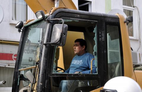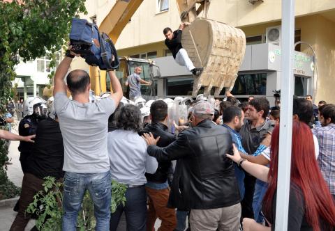 Binaya kepçe darbelerinin vurulmasıyla ellerine parke taşı ve sandalyeleri alan bazı protestocu grup kepçenin camlarını kırdı. Bir grup 100 metre ileride barikat kuran polisi taşladı.