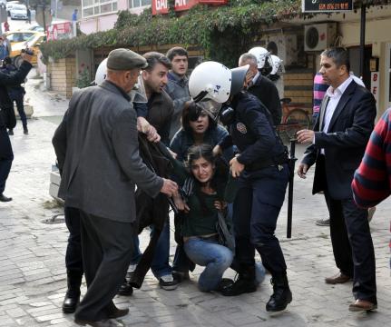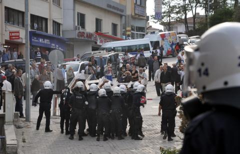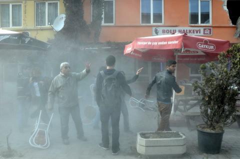 HALKEVİ ÖNÜNDE TAŞLAR HAVA DA UÇUŞTU. POLİS COP VE BİBER GAZIYLA KARŞILIK VERDİ