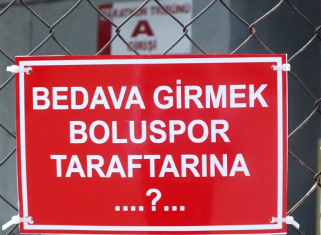 Son günlerde kamuoyunda en çok konuşulan konulardan biri olan bedava bilet dağıtımı ve taraftarların stadyumlara ücretsiz girmelerine en büyük atıflardan biri Boluspor’dan geldi. Maraton Tribünü’nün dışına kimler tarafından asıldığı belli olmayan 2 tabela kırmızı-beyazlı taraftarların beğenisini kazandı. Ücretsiz maça girmenin önüne geçmek için yerleştirilen tabelalarda, “Bedava girmek Boluspor taraftarına ….?...” yazıyor.
