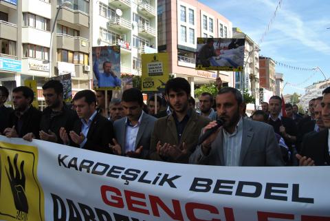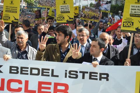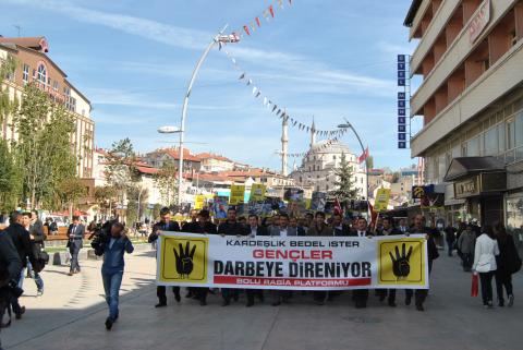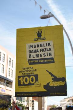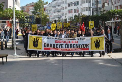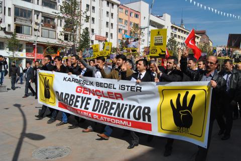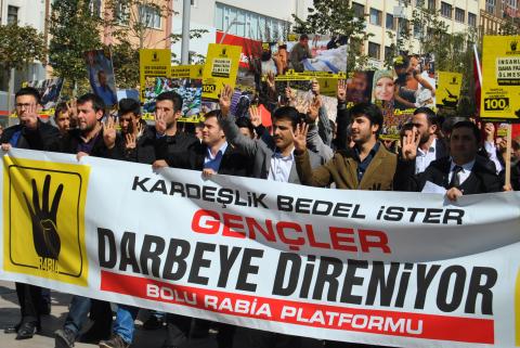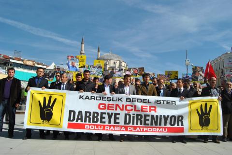 Mısır'daki askeri darbe, Genç Memur-Sen öncülüğünde Rabia Platformu'nun desteğiyle bir kez daha protesto edildi. Yaklaşık 150 kişilik grup, darbenin 100’üncü gününde, dün saat 12.00’de Belediye Meydanı’nda toplandı. Kalabalık grup, “Kardeşlik bedel ister, gençler darbeye direniyor” yazılı pankart açıp, ellerinde darbe karşıtı dövizlerle İzzet Baysal Caddesi boyunca protesto yürüyüşü gerçekleştirdi. Darbe karşıtı sloganlar atan grup, sıklıkla Mısır’daki darbe karşıtı eylemlerin sembolü haline gelen Rabia işareti yaptı.