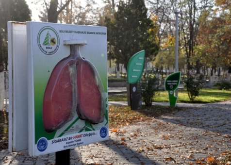 Sokaklarda yere atılan sigara izmaritlerinin çevre kirliliğini artırması üzerine Bolu Belediyesi tarafından örnek bir proje başlatıldı. Halkın yoğun olarak kullandığı park ve bahçeler olmak üzere ana caddelere sigara izmariti toplama kutuları yerleştirildi. Akciğer görüntüsündeki sigara kutularının üzerine “Bolu Belediyesi sigaraya hayır diyor”, “Sigarasız bir hayat dileğiyle” yazısı yazıldı. Belediye Başkanı Alaaddin Yılmaz’ın imzasını taşıyan kutuların boş kalması vatandaşların çevre kirliliğine karşı duyarsızlığını gözler önüne serdi. İzmarit toplama kutularının boş kaldığı sokaklarda sigaraların hala yerlere atılması dikkat çekti. İzmarit toplama kutularının üzerine ayrıca sigara bırakma ve danışma hattı alo 171’in numarası da yerleştirildi.