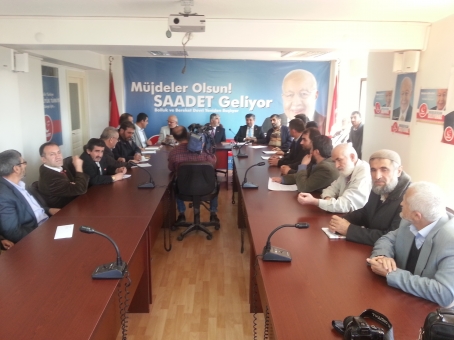 SP İl Başkanı Veysel Çetinkaya, dün saat 12.30’da partisinin il başkanlığı binasında bir basın toplantısı düzenledi. Parti yönetim kurulu üyelerinin katıldığı toplantıda konuşan Çetinkaya, “Özellikle seçim atmosferine girdiğimiz şu günlerde, Saadet Parti’mizin başka bir siyasi görüşle paralelde olduğu, aralarında hiçbir fark olmadığı, aynı kökten geldiği belirtilerek siyasi arenada yok sayılmak istenilmektedir. Hatta Milli Görüş’e ait kavramlar dile getirilerek aziz milletimiz yanıltılmaya çalışılmaktadır. Bilindiği gibi Milli Görüş hareketi 1969’larda merhum liderimiz Prof. Dr. Necmettin Erbakan tarafından kurulan, sırasıyla Milli Nizam, Milli Selamet, Refah, Fazilet ve şimdi de Saadet Partisi ile aziz milletimize en hayırlı hizmetleri sunan bir davadır. Bilindiği gibi Erbakan Hocamız 2011 yılında Saadet Partisi’nin Başbakanı olarak ahrete irtihal etmiştir. O son dönemde bu konu hakkında şöyle demiştir. ‘Milli Görüş’ün tek temsilcisi Saadet Partisi’dir. Saadet Partisi’nin dışında başka partilere mensup bir kişinin bende Milli Görüşçü’yüm demesi sadece palyaçoluk yapması demektir.’ O bize Hakk’ı üstün tutan, zalimle mücadele eden Milli Görüş’ü ve O’nun tek temsilcisi Saadet Partisi’ni bırakmış, O’nun bıraktığı yerden bizler Saadet Partisi olarak bu kutlu yolda şanla şerefle yolumuza devam etmekteyiz” dedi.