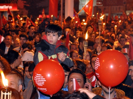 CHP Bolu İl Başkanlığı tarafından 29 Ekim Cumhuriyet Bayramı kutlamaları için fener alayı düzenlendi. Hükümet Meydanı’ndan başlayan yürüyüşe yaklaşık binlerce kişi katılırken, İzzet Baysal Caddesi boyunca yürüyüş yapıldı. Ellerinde Türk bayrakları ve fener alayıyla bankalar önüne kadar gelen kalabalık, burada CHP Bolu İl Teşkilatı’nın konuşmalarını dinledi. Merkez İlçe Başkanı Hüseyin Yıkılmaz’ın ‘Hoşgeldiniz’ konuşmasından sonra CHP Bolu Milletvekili Tanju Özcan mikrofonu aldı. Zara konseri nedeniyle kapatılan alanın bilerek kapatıldığını söyleyen Özcan, “Bugün burada Bolulular toplanamasın diye önümüze kamyonları çektiler. Barikatlar kurdular. Ellerinden geleni yaptılar. O zaman Bolulular, yasaklanan andımızı onlara duyurmaya var mısınız?” diyerek herkesi andımızı okumaya davet etti. Eline aldığı kağıttan andımızı okuyan Özcan’a binlerce kişi eşlik etti.