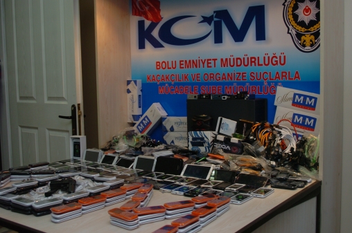 Doğu illerinden gümrük kaçağı olarak getirilen cep telefonlarının piyasaya satışa sunulduğu ihbarını alan Bolu Kaçakçılık ve Organize Suçlarla Mücadele Şube Müdürlüğü ekipleri, geniş çaplı arama başlattı. Çalışma kapsamında belirlenen adreslere eşzamanlı operasyon düzenlendi. Operasyonda 6 kişi gözaltına alınırken, şüphelilerin ev ve işyerlerinde yapılan aramalarda 357 kaçak cep telefonu ile 10 imei klonlama cihazı, 1 klonlama işlemlerinin yapıldığı bilgisayar, telefonlara ait çok sayıda batarya, kulaklık, şarj cihazları ve çeşitli aparat ele geçirildi.