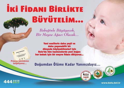 Bolu Valiliği, Bolu Belediyesi ve Bolu Orman Bölge Müdürlüğü tarafından ortaklaşa hayata geçirilen ‘İki Fidanı Birlikte Büyütelim’ projesi kapsamında oluşturulan Bebek Meyve Bahçesi’nde 2013 yılında dünyaya gelen her bebek adına bir meyve ağacı bulunuyor. Ayrıca proje kapsamında 2013 yılında dünyaya gelen ve bebeklerinin adına bir meyve ağacı olan ailelere sertifikaları da verilecek. 14 Kasım 2013 Perşembe günü saat 15.30’da Bolu Belediyesi Meclis Salonu’nda gerçekleştirilecek sertifika törenine 2013 yılı içerisinde bebekleri olan tüm aileler bebekleri ile birlikte davetlidir.