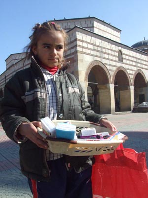 Satış yapmanın yanı sıra meydandaki güvercinleri izleyen Yıldız, "Okula bu yıl başladım. Ailemizin maddi geliri yetersiz. Okul için aldığım 25 YTL'lik defterlerin parasını kazanabilmek için satış yapmaya çalışıyorum" dedi. Çalışmaktan ve aile bütçesine yardımcı olmaktan mutlu olduğunu anlatan Yıldız, babasının inşaat işçisi olduğunu, annesinin ise kendi gibi ihtiyaç maddeleri sattığını belirtti.