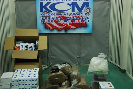 İl Emniyet Müdürlüğü Kaçakçılık ve Organize Suçlarla Mücadele Şube Müdürlüğü ekipleri, Bolu’da hediyelik eşya adı altındaki işyerlerinde kaçak sigara, tütün ve içki satıldığı ve küçük yaştaki çocuklara da satış yapıldığını tespit etti. Gerçekleştirilen operasyonlarda 3 ayrı işyerine eş zamanlı baskın düzenleyen polis ekipleri, işyerlerinde toplam 271 paket değişik markalarda kaçak sigara, 28 bin 40 adet tütün ile doldurulmuş dolu içime hazır makaran, 481 paket sigara sarma kağıdı, 73 adet sigara sarma makinası, 37 bin 200 adet boş makaron, 114 kilogram kıyılmış tütün, 10 paket pipo tütünü, 46 adet değişik markalarda puro, 27 adet (13 kilogram) kaçak çay, 2 adet Ballantines marka 1 litrelik kaçak viski, 57 adet (7 kilo) nargile tütünü ele geçirdi.