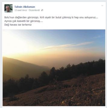 İl Özel İdaresi Genel Sekreterliği görevinden istifa ederek, Ak Parti Bolu Belediye Başkan Aday Adayı olan Tahsin Akduman, Facebook’taki kişisel sayfasında yayınladığı ileti ile gündeme geldi. Akduman Facebook’ta Bolu’yu çevreleyen dağlardan çekilmiş bir görüntüyü yayınladı. Akduman, takipçileriyle paylaştığı iletisinde Bolu’nun havasından yakınarak, Bolu’da vatandaşların kirli bir hava soluduğunu savundu. Akduman iletisinde, “Bolu'nun dağlardan görünüşü. Kirli siyah bir bulut çökmüş ki hep onu soluyoruz... Ayrıca çok kasvetli bir görünüş... Dağ havası ise tertemiz” ifadelerine yer verdi.