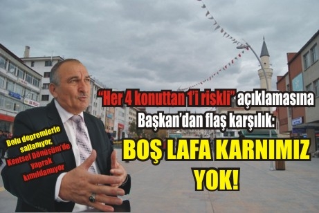 Yılmaz, Uçar’ın açıklamalarını öncelikle, “Lafı herkes yapar. Bolu’daki binaların bazıları sıkıntılıdır, demek yuvarlak bir laftır. Gerçekten mesleğine saygısı olan, gerçekten Bolu’yu seven kimler varsa, hele İnşaat Mühendisleri gibi bir oda bunu söylüyorsa, şu şu binalar sıkıntılıdır diyerek verileri önümüze koyması lazım. Eğer koymuyorsa, boşuna kimseden laf beklemiyoruz. Onlar dediği için değil, kanunlaştığı için Bolu’da Kentsel Dönüşümü uygulayacağız. Biz şu an Bolu’yu kentsel dönüşüme hazırlamak için tüm gücümüzle ekip olarak çalışıyoruz” sözleriyle karşıladı.