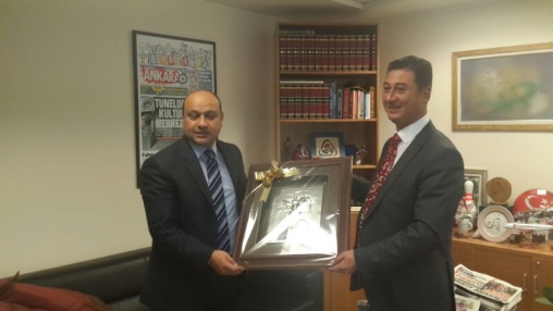 Caner Güngör ziyaret hatırası olarak Osman Altınışık’a içinde Köroğlu Heykeli bulunan çerçeveyi hediye etti.