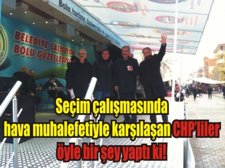 CHP Bolu Belediye Başkan Adayı Mehtap Özcan Mısırlıoğlu’nun seçim faaliyetleri kapsamında ev ziyaretleri gerçekleştiren CHP’li siyasiler, soğuk ve yağışlı hava muhalefeti engeline takılınca, çareyi Ak Partili Bolu Belediyesi’nce TIR dorsesinden oluşturulan özel platforma sığınmakta buldu.