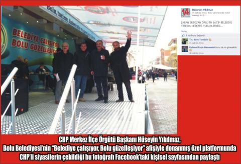 CHP’li siyasilerin “Belediye çalışıyor, Bolu güzelleşiyor” yazılı arka planla birlikte çekildikleri bu görüntüyü CHP Merkez İlçe Örgütü Başkanı Hüseyin Yıkılmaz, Facebook’taki kişisel hesabında paylaştı. Yıkılmaz, fotoğrafa espri yüklü bir dille, “Şaban Ertozan örgütü satıp Belediye TIR’ında çay yudumlarken” ifadelerini kullandı.