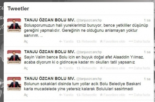 Kar nedeniyle okulların tatil olduğunu duyuran Bolu Valisi İbrahim Özçimen’e atıfta bulunan Tanju Özcan attığı twitte, “Sayın Valim bence Bolu için en büyük doğal afet Alaaddin Yılmaz, acaba diyorum ki o gidinceye kadar mı okulları tatil etseniz” ifadelerine yer verdi.