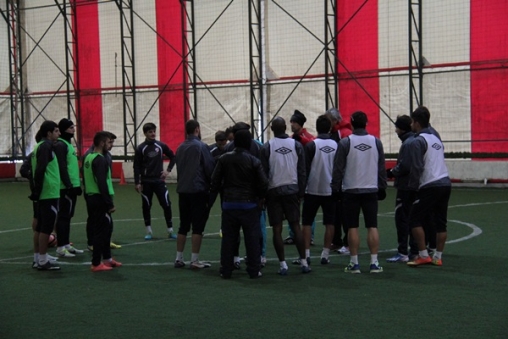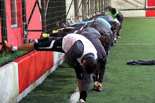 Bolu’yu etkisi altına alan kar yağışı sonrası antrenman sahasının karla kaplı hale gelmesi üzerine futbolcular, teknik heyetin talimatı üzerine hazırlıklarını hala sahada yaptı.