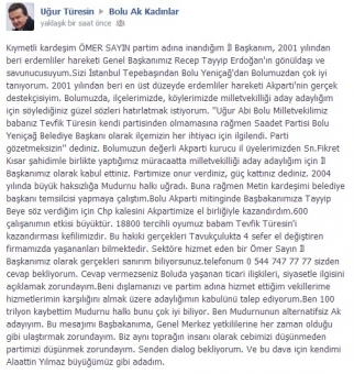 Ömer Sayın'ın kendisi için o dönemde ; ''Uğur Abi Bolu Milletvekilimiz babanız Tevfik Türesin kendi partisinden olmamasına rağmen Saadet Partisi Bolu Yeniçağ Belediye Başkanı olarak ilçemizin her ihtiyacı için ilgilendi. Parti gözetmeksizin'' ifadelerini kaydettiğini belirten Türesin sözlerini şu şekilde dürdürdü, "Bolumuzun değerli Akparti kurucu il üyelerimizden Sn.Fikret Kısar şahidimle birlikte yaptığımız müracaatta milletvekilliği aday adaylığım için İl Başkanımız olarak kabul ettiniz. Partimize onur verdiniz, güç kattınız dediniz. 2004 yılında büyük haksızlığa Mudurnu halkı uğradı. Buna rağmen Metin kardeşimi belediye başkanı temsilcisi yapmaya çalıştım.Bolu Akparti mitinginde Başbakanımıza Tayyip Beye söz verdiğim için Chp kalesini Akpartimize el birliğiyle kazandırdım.600 çalışanımın etkisi büyüktür. 18800 tercihli oyumuz babam Tevfik Türesin'i kazandırması kefilimizdir. Bu hakiki gerçekleri Tavukçulukta 4 sefer el değiştiren firmamızda yaşananları bilmektedir. Sektöre hizmet eden bir Ömer Sayın İl Başkanımız olarak gerçekleri sanırım biliyorsunuz.telefonum 0 544 747 77 77 sizden cevap bekliyorum. Cevap vermezseniz Boluda yaşanan ticari ilişkileri, siyasetle ilgisini açıklamak zorundayım.Beni dışlamanızı ve partim adına hizmet ettiğim vekillerime hizmetlerimin karşılığını almak üzere adaylığımın kabulünü talep ediyorum.Ben 100 trilyon kaybettim Mudurnu halkı bunu çok iyi biliyor. Ben Mudurnunun alternatifsiz Ak adayıyım. Bu mesajımı Başbakanıma, Genel Merkez yetkililerine her zaman olduğu gibi ulaştırmak zorundayım. Biz aynı toprağın insanı olarak cebimizi düşünmeden partimizi düşünmek zorundayım. Senden dialog bekliyorum. Ve bu dava için kendimi Alaattin Yılmaz büyüğümüz gibi adadım"
