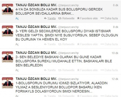 Özcan geçtiğimiz hafta alınan kötü sonuçlar sonrası yönetime gönderdiği, “Gereğini yapın” mesajından sonra dün de Boluspor üzerinden Yılmaz’a yüklendi. Boluspor ile ilgili olarak Yılmaz’ı suçlayan Özcan twitter hesabından paylaştığı mesajında: “Boluspor’un durumu içimi sızlatıyor. Alaaddin Yılmaz’a sesleniyorum: Boluspor başarılıyken formayla dolaşıyordun. Şimdi nerdesin? Sen Belediye Başkanı olarak Boluspor’a sürekli müdahale ettin. Başkanları bile sen belirledin. Yeri geldi seçimlerde Boluspor’u da siyasi istismar vesilesi yaptın, şimdi niye susuyorsun? Sebep olduğun bu duruma ya hemen el koy, ya da Boluspor’u gerçek Boluspor sevdalılarına bırak.”