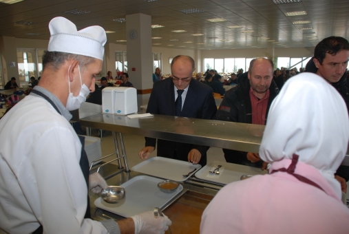 Ziyaretin ardından protokol üyeleri işçilerin yemekhanesine gitti. Masalarına yemeklerini istemeyen protokol üyeleri, işçilere sıraya girip tabldot yemek aldı.