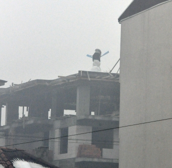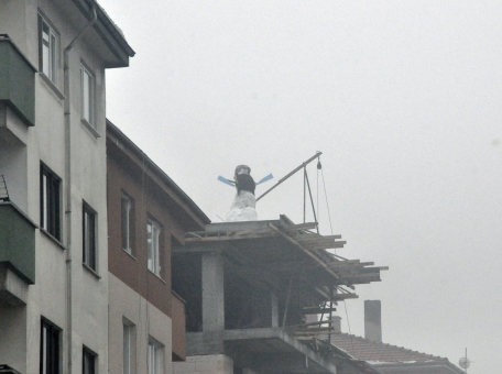 Karamanlı mahallesi Konuralp Caddesi Ertuğrul Sokak üzerinde bulunan 5 katlı bir inşaatın çatısındaki kardan adamı görenler şaşırdı. Geçtiğimiz ay yoğun kar yağışının etkisi altında kalan kent merkezinde karlar hala erimezken, inşaat işçileri tarafından yapılan kardan adam görenlerin beğenisini kazandı. Kar yağışı nedeniyle çalışmalara ara verilince, boş vakitlerini değerlendirmek isteyen işçiler kardan adam yaptı. Kardan adamın 5 katlı binanın çatısında yer alması dikkat çekerken, inşaatın yanından geçen vatandaşlar gülerek tepki verdi.