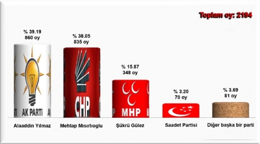 Yapılan oylama neticesinde Ak Parti Bolu Belediye Başkan Adayı Alaaddin Yılmaz 860 oy ile oyların yüzde 39.19’unu aldı. CHP Belediye Başkan Adayı Mehtap Mısırlıoğlu ise 835 oy ile Başkan Yılmaz’ı çok yakından takip etti. Mehtap Mısırlıoğlu da oyların yüzde 38.05’ine sahip oldu. MHP Belediye Başkan Adayı Şükrü Gülez 348 oy ile oyların yüzde 15.87’sini aldı. 81 kişi yani yüzde 3.69’luk bir kesim diğer başka bir partiye oy kullanmak istediğini ifade ederken, Saadet Partisi de 70 oy ve yüzde 3.20’lik pay elde etti.