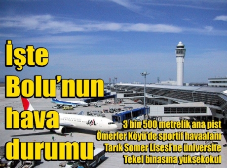 Bolu’ya havaalanı kurmak üzere çalışma başlatan Bolu Belediyesi, Tugay Komutanlığı’na ait askeri havaalanının sivil uçuşlara da açılması için çalışmalara hız verdi. Türk Hava Kurumu Başkanı ve Gümrük ve Ticaret Bakan Yardımcısı Fatih Metin’in Bolu’ya gelmesi ile başlatılan çalışma kapsamında Tugay’da 3 bin 500 metre uzunluğunda her türlü uçağın iniş yapabileceği bir yerin onayı alındı. Ne zaman yapılacağına ilişkin sürenin Bolu Belediyesi tarafından belirleneceği ifade edilirken, Abant Yolu üzerinde bulunan Ömerler Köyü sınırlarındaki Karayollarına ait eski malzeme ocağının bulunduğu alan da sportif havaalanı için düzenlenecek. 1 km uzunluğunda yapılacak alanda model uçakların da inebileceği mini pistler oluşturulacak.
