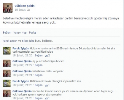 Geçen gün facebookta yazdığınız o uzun şikayet yazısını gördüm de bu kadar yakınmanıza anlam veremedim.Partiniz bence doğru karar vermiş.O anlamsız ve noktalama işaretsiz cümleler nedir öyle?Daha Türkçeyi doğru kullanamıyorsunuz ama listede üst sırada olmayı istiyorsunuz.Ayrıca partinize yürekten bağlı olsaydınız tepkinizi bu yolla göstermezdiniz.Bunlar parti içi sorunlardır.Tam seçim öncesi koltuk sevdası uğruna gönül verdiğiniz ve emek harcadığınızı söylediğiniz partinize veryansın etmeniz hata olmuş.