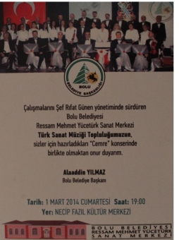 Bolu Belediyesi Ressam Mehmet Yücetürk Sanat Merkezi Türk Sanat Müziği Topluluğu konser organizasyonlarına bir yenisini daha eklemeye hazırlanıyor. Önceki konserlerde kalplerden dudaklara yükselen sesi hayranlıkla dinletmeyi başaran müzik topluluğu, eşsiz nağmeleri 1 Mart Cumartesi günü yeniden seslendirecek. Necip Fazıl Kültür Merkezi’nin ev sahipliği yapacağı konser “Cemre” ismi ile sevenleriyle buluşacak.