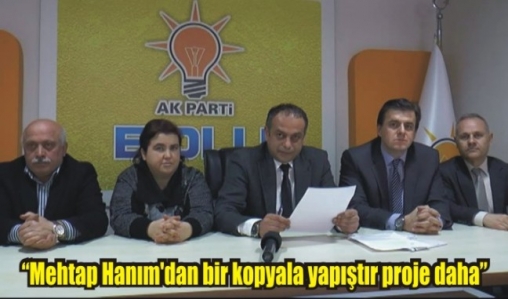 “Yerel seçimlerin yaklaşmasıyla beraber AK Parti dışındaki partilerin ve adaylarının, Bolu için, Bolu’ya hizmet için, vatandaş için proje üretemeyişini görmek, AK Parti’de gördüklerini proje olarak Bolu Halkına sunmak tek perdelik bir oyundur. Bu tek perdelik oyun daha öncede söylediğimiz gibi 30 Mart’ta sona erecektir. Bu oyunun bir parçası da CHP Adayı Sayın Mehtap Hanım’ın bizden kopyala yapıştır yaptığı uygulama projelerine tarafımızdan 2012 yılında başlanan Büyüksu Göleti projesidir. Belediyemizin dünyada ender görülen, Olimpiyat ve Spor Kompleksi Projesi’nin sadece bir parçası olan Büyüksu Göleti projesini, kendisine ait bir projeymiş gibi Bolu halkına kopyala yapıştır metodu ile sunan Sayın Mehtap Hanımın bu projesi de bizim tarafımızdan Orman ve Su İşleri Bakanlığı’na 20.09.2013 tarihinde uygulama projeleri ile birlikte sunulmuştur.