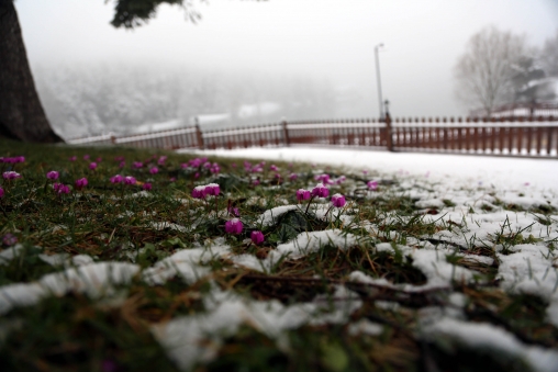 Abant Tabiat Parkı'nda kar kalınlığının 15 santimetreye ulaşması nedeniyle çiçekler ve çiğdemler beyaz örtüyle kaplandı.