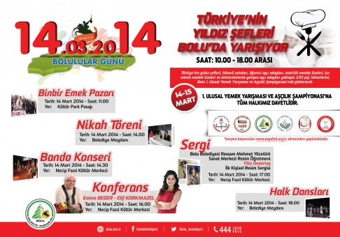 Her ayın 14’ü 2014 Bolu yılı etkinlikleri kapsamında birbirinden güzel programlarla kutlanmaya devam ediyor. 14 Mart Cuma günü kutlanacak olan birçok etkinlik ve gösterinin yer alacağı program yine dolu dolu geçecek. Mart ayı etkinlikleri Bolu’nun adına yakışır şekilde lezzet ustalarını ağırlayacak. 14-15 Mart tarihlerinde 1.Ulusal Yemek yarışması ve Aşçılık Şampiyonasının startı verilecek. 250 şef bütün hünerlerini göstermek için yarışacak.