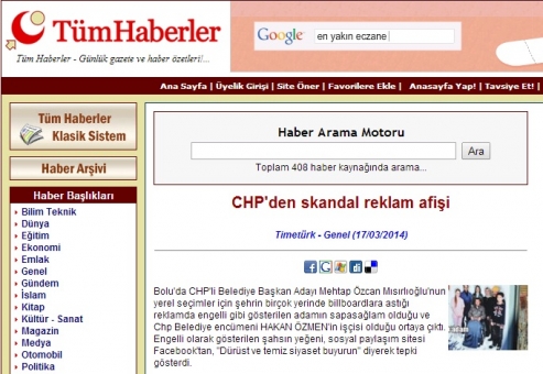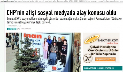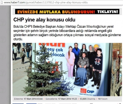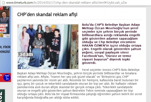 Bolu’da CHP’li Belediye Başkan Adayı Mehtap Özcan Mısırlıoğlu’nun yerel seçimler için şehrin birçok yerinde billboardlara astığı reklamda engelli gibi gösterilen adamın sapasağlam olduğu ortaya çıktı. Engelli olarak gösterilen şahsın yeğeni, sosyal paylaşım sitesi Facebook’tan, “Dürüst ve temiz siyaset buyurun” diyerek tepki gösterdi.