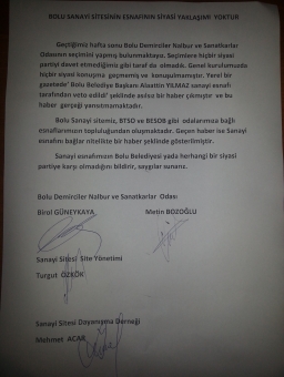 Sanayi sitemiz, Bolu Ticaret ve Sanayi Odası (TSO) ve Bolu Esnaf ve Sanatkarlar Odaları Birliği (BESOB) gibi odalarımıza bağlı esnaflarımızın topluluğundan oluşmaktadır. Geçen haber ise sanayi esnafını bağlar nitelikte bir haber şeklinde gösterilmiştir. Sanayi esnafımızın Bolu Belediyesi ya da herhangi bir siyasi partiye karşı olmadığını bildirir, saygılar sunarız.”