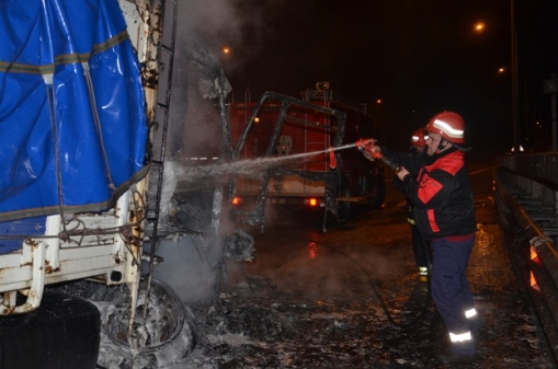 Olay, dün saat 00.20 sıralarında TEM Otoyolu Bolu Dağı Tüneli çıkışında meydana geldi. İstanbul istikametine giden Murat A. İdaresindeki 63 YD 012 plakalı kamyonet, Bolu Dağı Tüneli çıkışı motor kısmından tutuştu. Vites değiştirmek için elini vites topuzuna atan sürücü kıvılcımları fark edince kamyoneti emniyet şeridine çekip, kendini araçtan dışarı attı. Araçta bulunan yangın tüpü ile alevlere müdahale eden talihsiz sürücü başarısız oldu. Motor kısmından başlayan alevler kısa sürede kamyonetin ön kısmını sardı. Kamyonet alev topuna dönerken, sürücü durumu itfaiye ekiplerine bildirdi. Olay yerine gelen Karayolları’na ait itfaiye ekipleri yanan kamyoneti söndürdü. Yangında kamyonet kullanılamaz hale geldi.