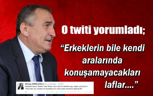 CHP’yi “Kazanabilmek için, insanlara şirin görünebilmek için her türlü şeyi mubah sayan bir yapı” olarak tanımlayan Başkan Yılmaz, Mısırlıoğlu’nun attığı bir twitte kullandığı “Bolu sana sandıkta abanacak” cümlesini de eleştirdi. Böyle bir sözün bir kadın tarafından sarf edildiğine inanmadığını söyleyen Yılmaz, “Benim üslubumda kaba laflar vardır. Çünkü ben Boluluyum ve Boluluca konuşurum. Ama erkeklerin bile kendi aralarında konuşamayacakları, edeben doğru olmayan lafları, belki çok samimi olan erkeklerin kendi aralarında yaptığı türden bir konuşmayı bir bayanın yaptığına benim hala inanasım gelmiyor. Çok yanlış bir şey. Ben bir bayanın öyle bir laf edeceğine inanmıyorum” dedi.