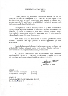 “İlimiz Merkez İlçe Semerkant Mahallesi’nde bulunan 759 ada, 105 parsel no.lu 630,00 m2 ve 86 parsel no.lu 317,00 m2 taşınmaz, tapuda adıma kayıtlıdır. 02.08.2013 tarihinde düzenlenen imar planında görüldüğü üzere yapılaşma anında 759 ada 89 parsel no.lu 288,00 m2 yüzölçümlü taşınmaz malla birlikte değerlendirileceği belirtilmiştir. İmar planında belirtilen hususlar, ben ve bu işi bilen ve ilimizde iş yapan güvenilir inşaatçılar tarafından 89 parsel no.lu taşınmaz malın maliki olan Makbule Göynük ve emlakçısına imar durum belgesi verilerek birlikte değerlendirelim konusundaki görüşmeler sonucunda, uzun bir süre geçmesine rağmen bu güne kadar bir sonuç alınamamıştır. Bolu halkı arasındaki konuşmalar ve mahalli gazetelerde yazılan muhtelif yazılarda 3194 sayılı yasanın 18. Madde uygulaması çok kötü anlatılmıştır. Ancak, Bolumuzun güzelleşmesi, turizm yatırımlarının yapılması, eski görünümdeki binaların yıkılarak, yerine yeni modern binalar yapılması ve Bolumuzun modern bir görünüm kazanması gerekmektedir. Bu nedenle, Bolumuzun eski mahallelerinden olan Semerkant Mahallesi’ndeki 759 Ada’da, 3194 Sayılı İmar Kanunu’nun 18. Maddesi’nin uygulanması için gereğinin yapılmasına müsaadelerinizi arz ederim”