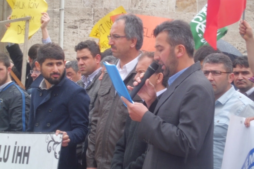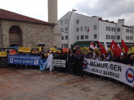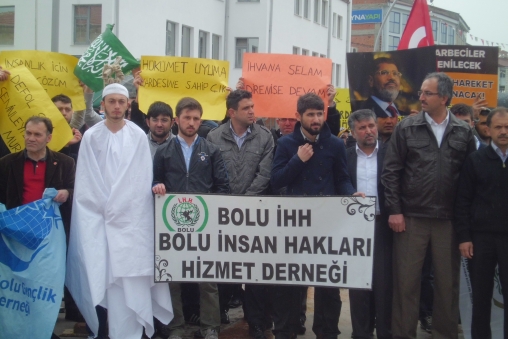 İHH Bolu Şubesi Mısır’da darbe karşıtı 529 kişiye verilen idam cezalarını Cuma namazı çıkışında protesto etti. İHH Bolu Şubesi Başkanı Fethi Sarımsakçı, “Mısır’da darbe mahkemesi 3 Temmuz askeri darbesinin ardından sözde hukuki bir (!) karara imza atarak 529 darbe karşıtı eylemci için idam cezasına hükmetti. Bu kararın gerekçesine göre söz konusu kişiler “şiddet ve terör” suçlamasıyla bu cezayı hak ettiler. İnsanlığa ve hukuka aykırı bu kararı kınamak, 529 Mısırlı mazlum kardeşimizin sesine ses katabilmek için tüm vicdan sahiplerini harekete geçmeye davet ediyoruz” dedi.