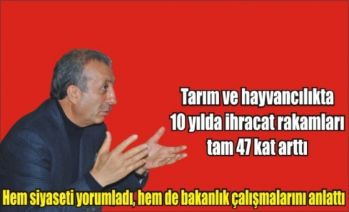Bakan Eker, açıklamalarının devamında ise, Bolu’nun gıda, tarım ve hayvancılık alanlarındaki göstergelerine dikkat çekti. Ak Parti hükümeti dönemlerinde Bolu’da gıda, tarım ve hayvancılık sektörlerinde ciddi büyüme meydana geldiğini kaydeden Bakan Eker, “Bolu, 10 yıl önce 2 milyon dolar ihracat yaparken, bugün 93 milyon dolarlık dünyaya tarım ve hayvancılık ürünü ihraç ediyor. Bu sektörün geliştiği anlamına gelmektedir. Bu durduk yerde olmuyor. Çünkü biz hükümet olarak, uyguladığımız destekleme politikalarıyla, projelerle, sektörlerle ilgili altyapı ve üstyapı yatırımlarıyla bunu gerçekleştirdik” dedi.
