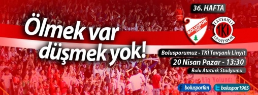BOLUSPORUMUZUN tv de izleyiciye değil, TRİBÜNDE DESTEĞE ihtiyacı var...BOLUSPORUMUZ belki üst lige çıkmak için finallere kalamadı ama alt lige düşmemek için final haftalarına kaldı...İYİ GÜN SEYİRCİSİ zaten bu maça gelmeyecektir, ama KÖTÜ GÜN TARAFTARI bütün sorumluluğuyla, boynuna atkısını takarak, üstüne o kutsal formasını giyerek tereddütsüz orada Bolu Atatürk Stadında olacaktır...BU MAÇTA DEĞİLSE HANGİ MAÇTA.?KURTULUŞ MAÇI SAVAŞMADAN KAZANILMAZ...BOLU GEÇİLMEZ, BOLU DÜŞMEZ...TRİBÜNE GEL, ŞEHRİNE TAKIMINA SAHİP ÇIK, DESTEK OL...BU BELKİ DE KURTULUŞ İÇİN SON 90 DAKİKA...”