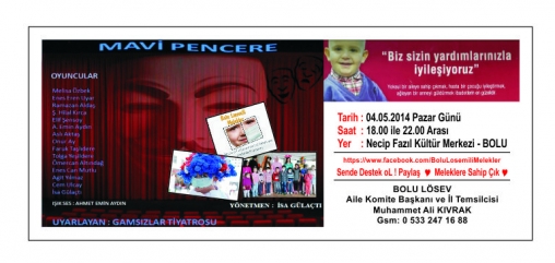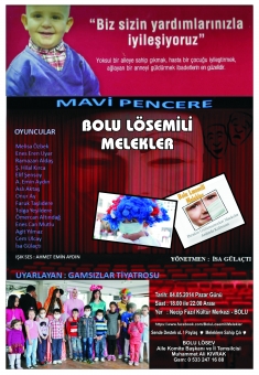 LÖSEV İl Temsilcisi Muhammet Ali Kıvrak, lösemili melekler yararına tiyatro gösterisi düzenleneceğini açıkladı. Kıvrak, Gamsızlar Tiyatro Grubu’nun Mavi Pencere adlı oyunun 4 Mayıs Pazar günü saat 18.00 ile 22.00 arasında sergileneceğini söyledi. Kıvrak, organizasyona katılım çağrısında bulunduğu açıklamasında, “Bolu'daki lösemili meleklerimizin yararına düzenlenecek olan Mavi Pencere adlı oyunda meleklerimizle bir aradayız. Sizlerden bekledikleri maddi ve manevi desteği esirgemeyelim. Bolu lösemili meleklerimize hep destek! Tam destek olalım! Onlar şu hayatta 1 - 7 - 15 yaşlarında o kadar büyük bir sorumlulukla başlıyorlar ki, bizler ise, hala ne dertlerin düşüncelerin peşindeyiz. Her lösemili çocuğun bu illeti yenebilmesi, ne kadar kemoterapiye ihtiyacı varsa, o kadarda morale ihtiyaçları vardır. Fark edenlere teşekkürler” ifadelerini kullandı.