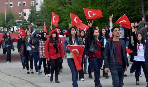 AİBÜ Gölköy Kampüsü Dil Eğitimi Araştırma ve Uygulama Merkezi (Dilmer) önünde toplanan ülkücü grup, ellerinde Türk bayrakları ve pankartlarla Eğitim Fakültesi’nin önünden yürüyüşe geçti. Yürüyüşe MHP Bolu İl Başkanı Mehmet Aydın, MHP’li Belediye Meclis Üyesi Ercan Üsküp, Bolu Ülkü Ocakları Başkanı Hafız Kenan Çevik ve yaklaşık 200 kişi katıldı. Rektörlük yolu boyunca Aktivite Merkezi önüne kadar yürüyen grup, “Ne mutlu Türk’üm diyene”, “Vatan sana canım feda”, “Bozkurtlar burada, çakallar nerede”, “Alpaslan Türkeş’in askerleyiz”, “Ferman Başbuğ’un, fakülteler bizimdir” şeklinde slogan attılar. Yağmur yağışı altında sırılsıklam ıslanan grup, hava muhalefetine aldırmadan yürüyüşünü sürdürdü.