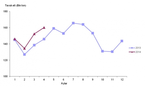 Takvim etkisinden arındırılmış seriye göre; kesilen tavuk sayısı bir önceki yılın aynı ayına göre yüzde 4 artarken, tavuk eti üretimi ise yüzde 9,7 arttı.