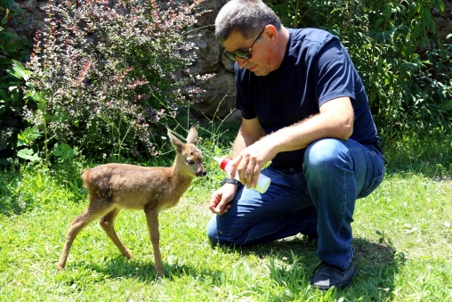 Burada kendisine yer yapılan karaca yavrusu, otel çalışanlarınca biberonla besleniyor.